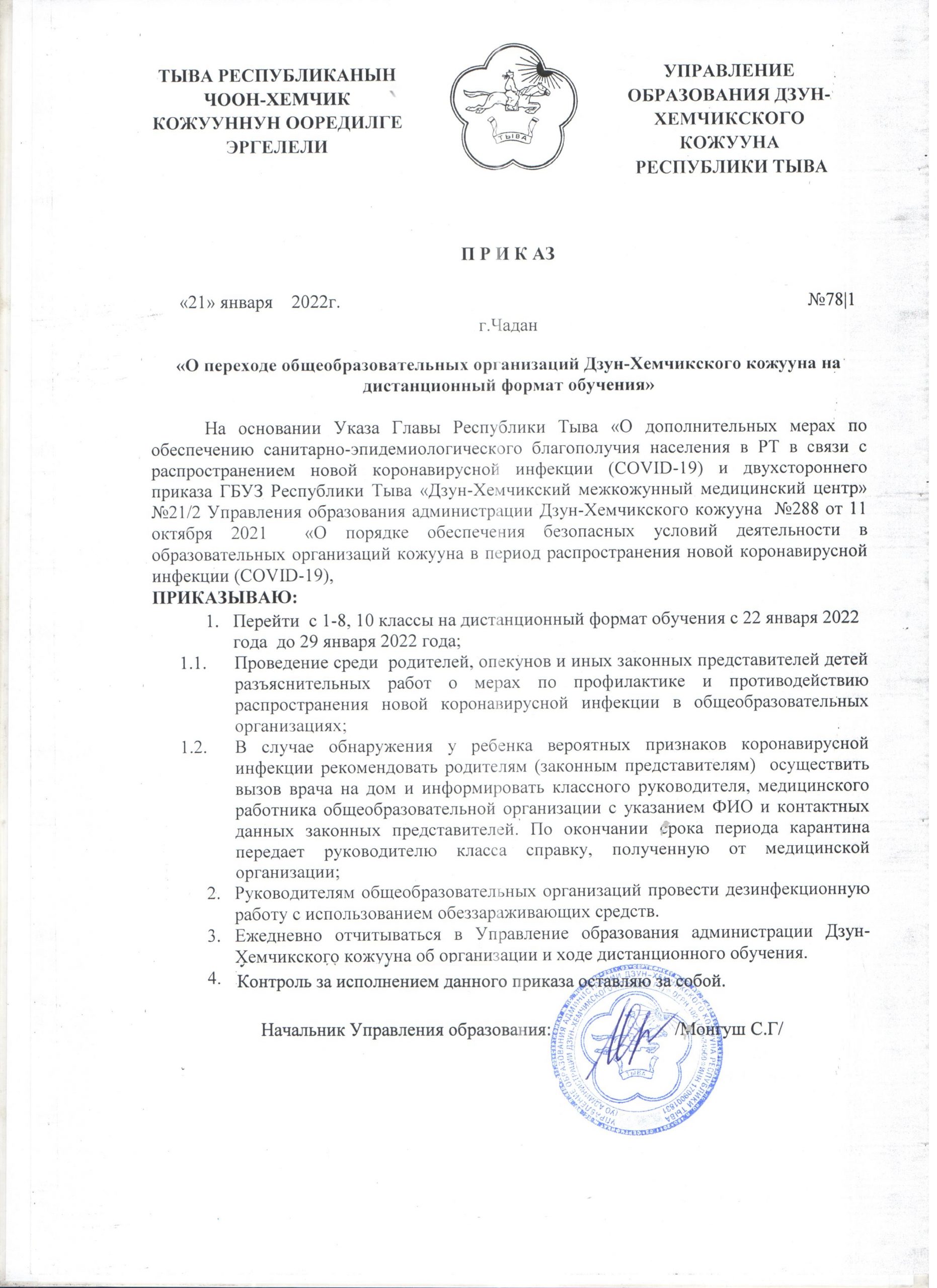 Без рубрики О переходе на дистанционный формат обучения 04.02.2022 / По решению оперштаба Тувы по коронавирусу, от 21 января, наша школа полностью переходит на домашнее обучение с 22 января 2022г. Приказ №78/1 от 21 января г. «О переходе образовательных организаций Дзун-Хемчикского кожууна на дистанционный формат обучения»Скачать